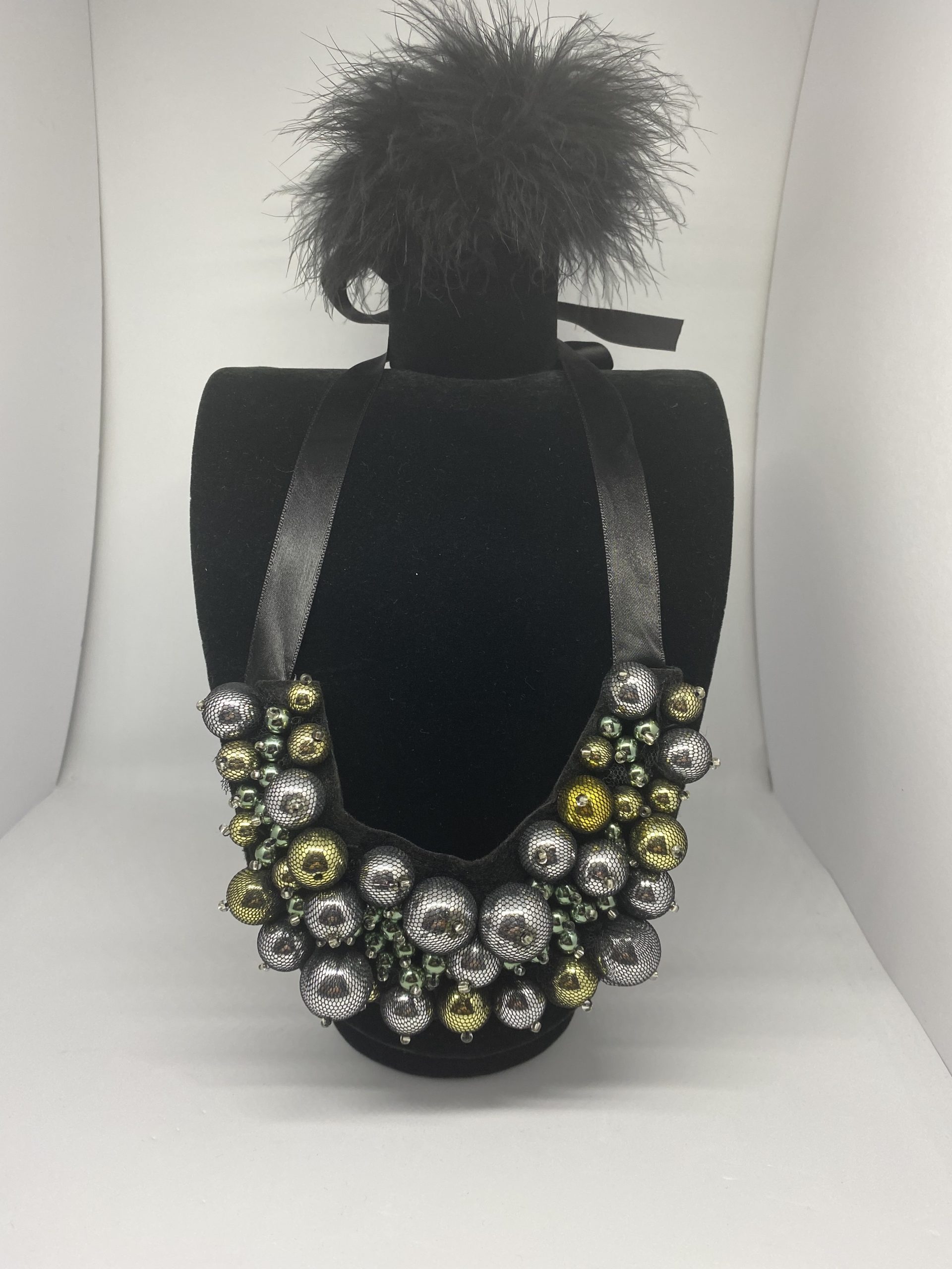 Statement cluster gold & silver bubble effect necklace with black tie ribbon .